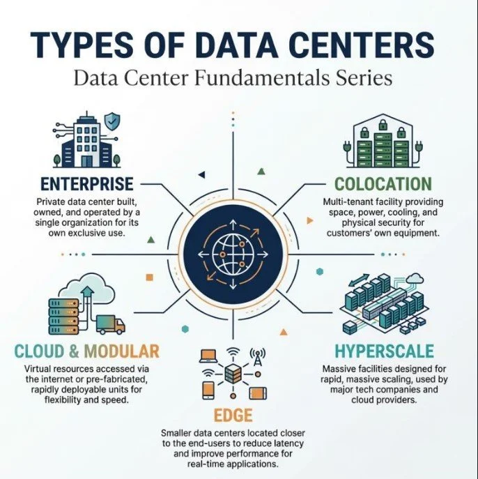 Data centers come in five main types — each designed to meet different operational, scale, and location needs: